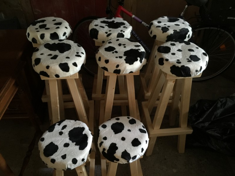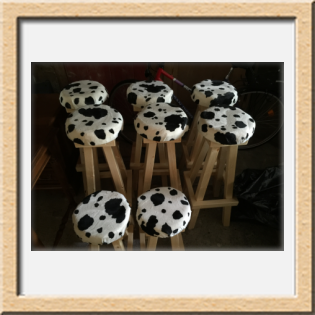Hocker: Unterbau aus Fichtenhoz, Sitzfläche gepolster und überzogen im Kuhfelllock (Stoff)
